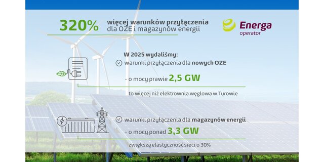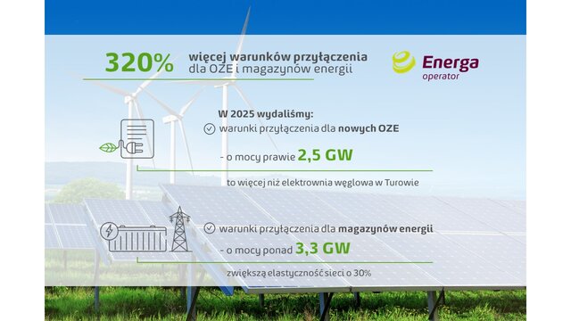 O 320 % więcej warunków przyłączenia dla OZE i magazynów energii wydała Energa‑Operator w 2025 r. Dzięki temu w najbliższym czasie mogą powstać nowe zielone źródła wywarzania o mocy prawie 2,5 GW, czyli więcej niż elektrownia węglowa Turów. Rekordy notują też warunki przyłączenia dla magazynów energii na łączną moc ponad 3,3 GW. Tak wysoki przyrost pozwoleń na przyłączenie do sieci możliwy jest dzięki inwestycjom w jej rozbudowę, modernizację i cyfryzację.